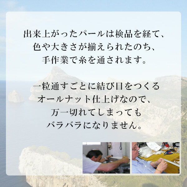 また、パールの間にひとつひとつ結び目を作るオールナット仕上げのため、万一、糸が切れてもバラバラになりません。